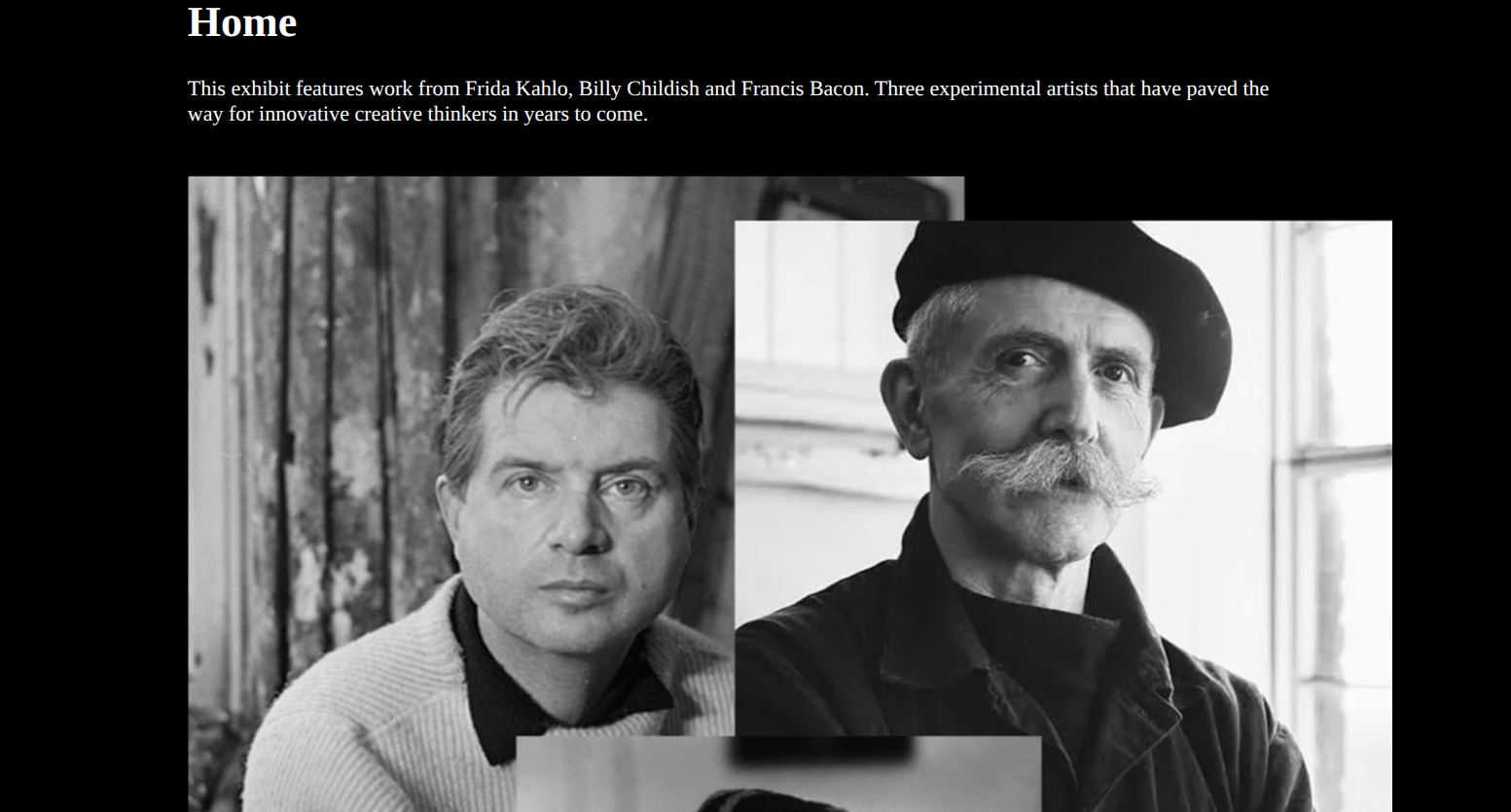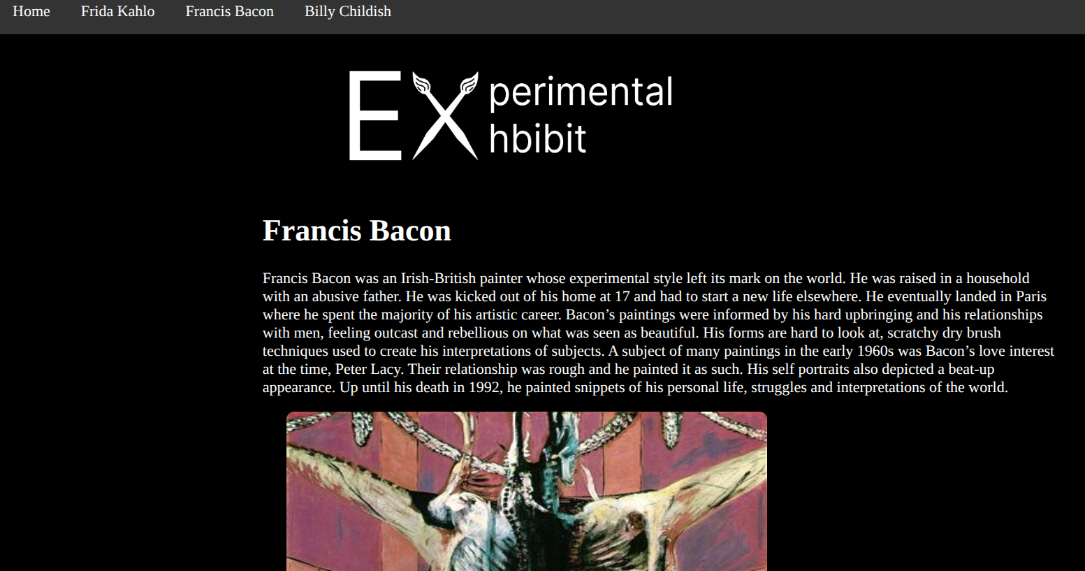 This website features an exhibit of a few of my favorite experimental artists. I compiled my research on painters Francis Bacon, Frida Kahlo, and Billy Childish into a web page that acts as an art gallery.